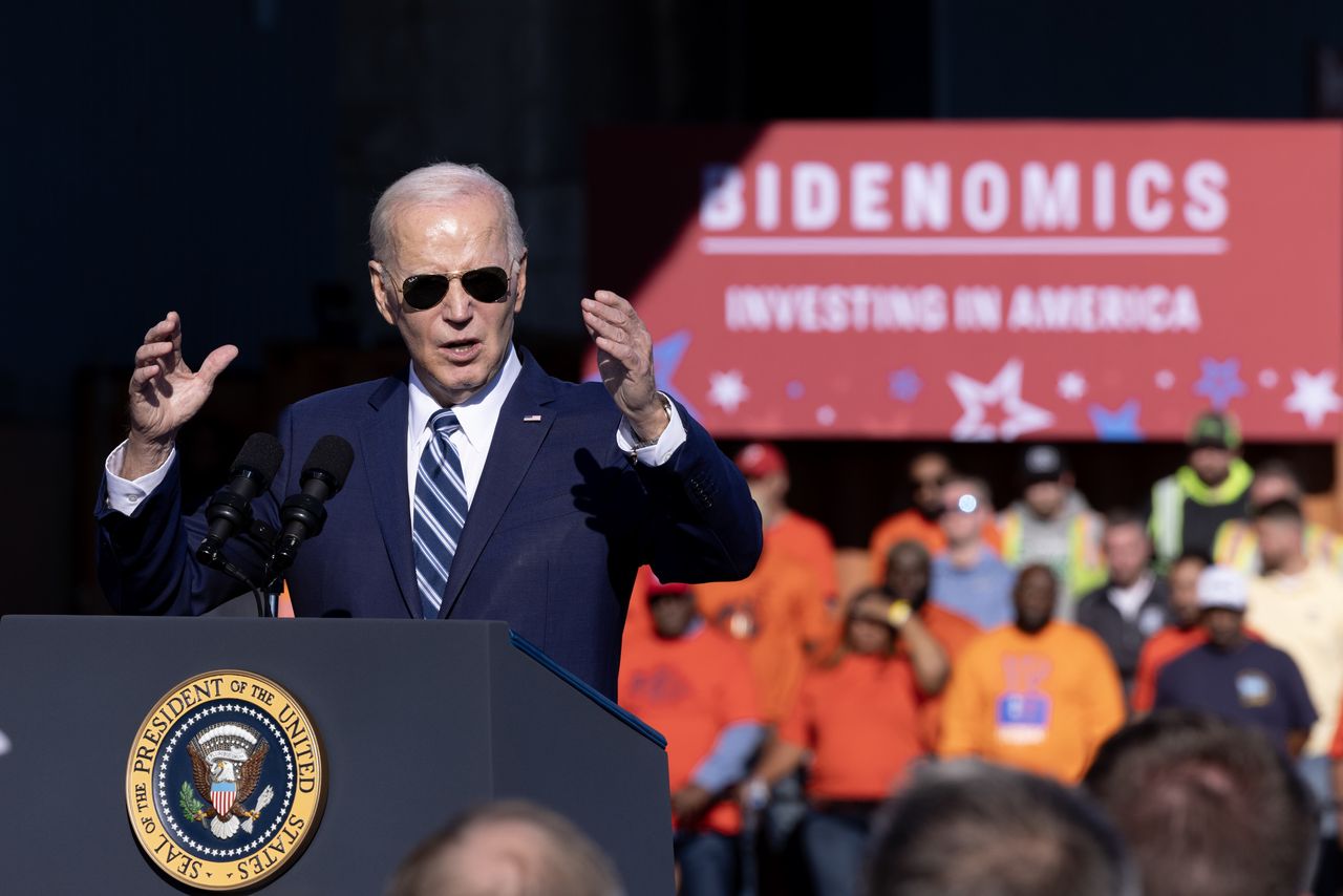 喬·拜登總統10月13日在費城蒂奧加海運碼頭髮表講話。照片:邁克爾·雷諾茲/Shutterstock刊登於2023年10月23日印刷版,標題為《為何拜登經濟學不受歡迎》。