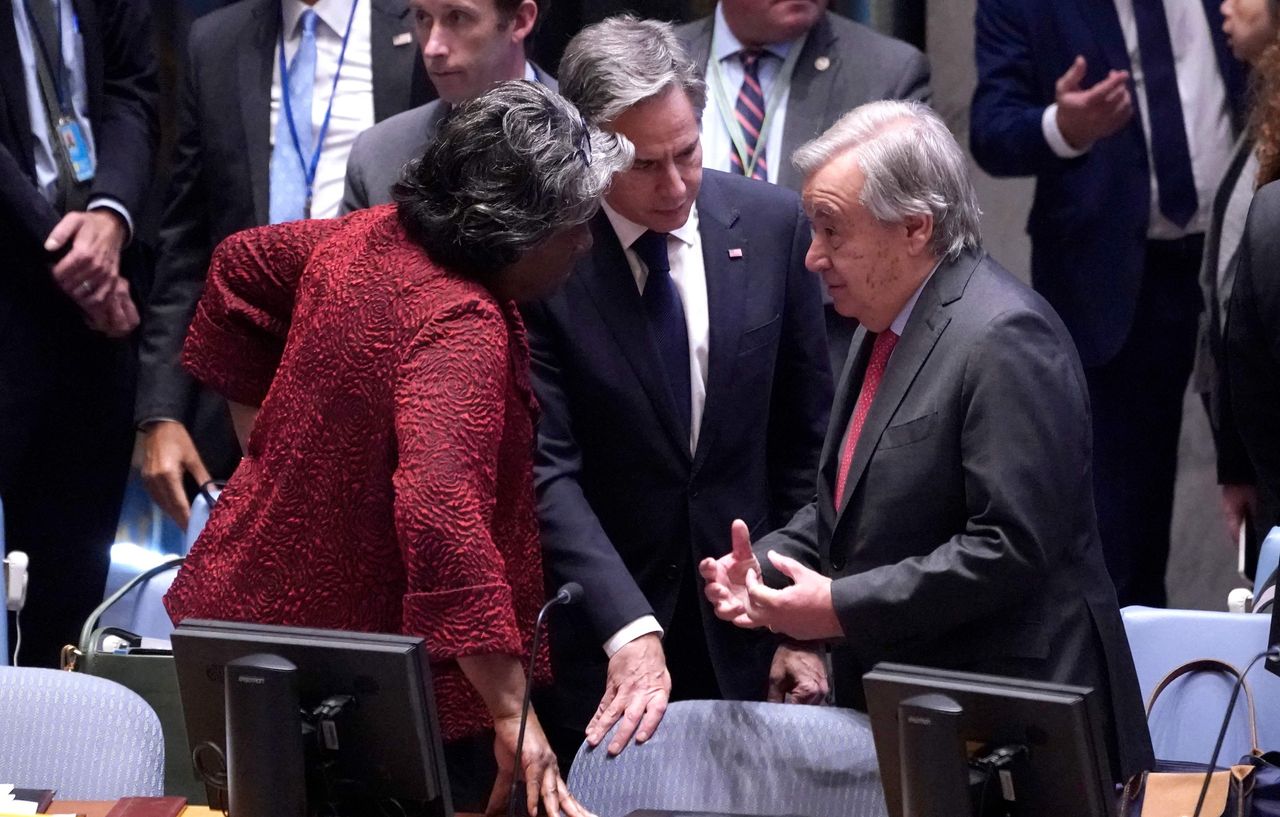 美國國務卿安東尼·布林肯(中)週二在聯合國安理會會議前與聯合國秘書長安東尼奧·古特雷斯及美國常駐聯合國代表琳達·托馬斯-格林菲爾德交談。照片:Timothy A. Clary/法新社/蓋蒂圖片社擁有安理會否決權的俄羅斯表示,不支持美國主導的決議草案。該草案譴責哈馬斯並敦促以色列採取一切必要措施保護平民,包括考慮實施"人道主義暫停"以便向加沙運送食品和援助物資。