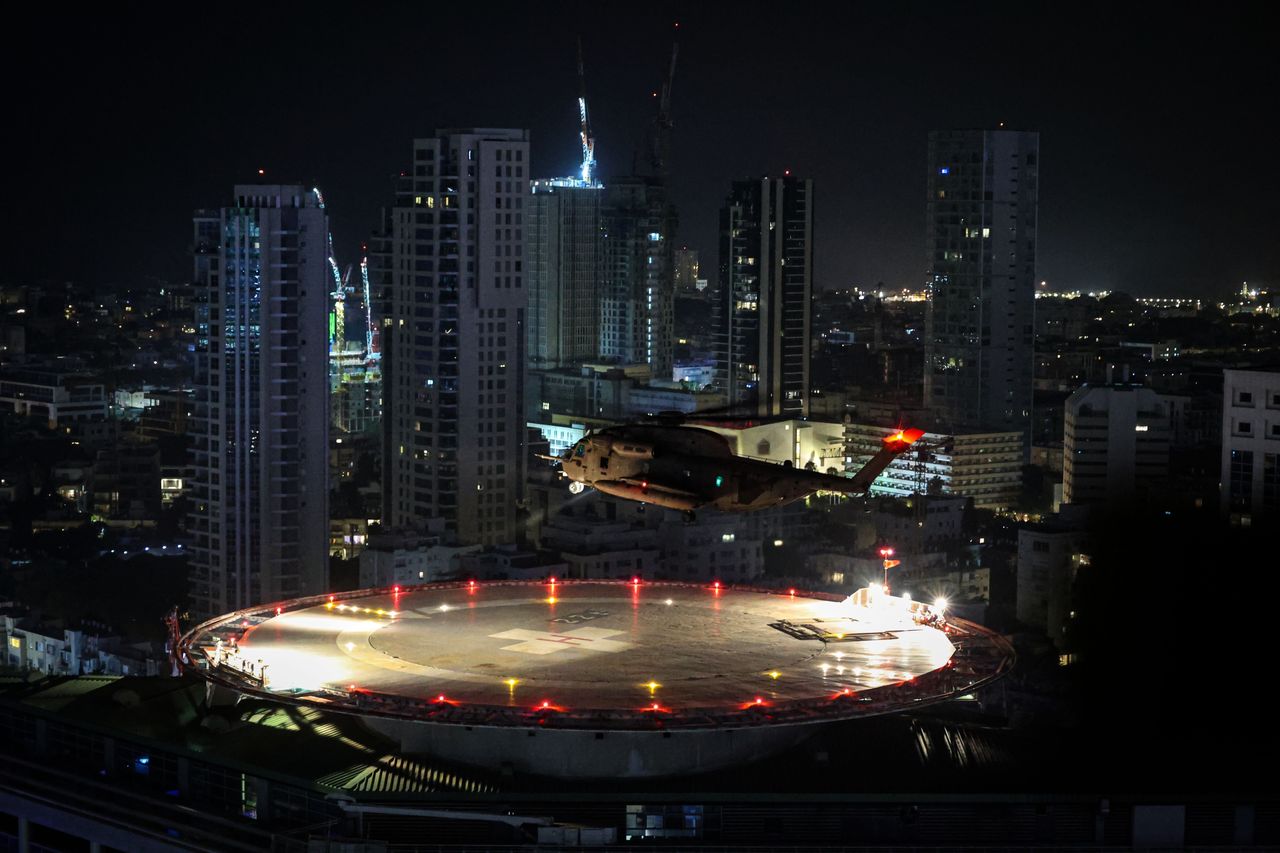 週二,一架載有獲釋人質的軍用直升機降落在特拉維夫一家醫院的屋頂上。圖片來源:Ilia Yefimovich/DPA/Zuma Press
