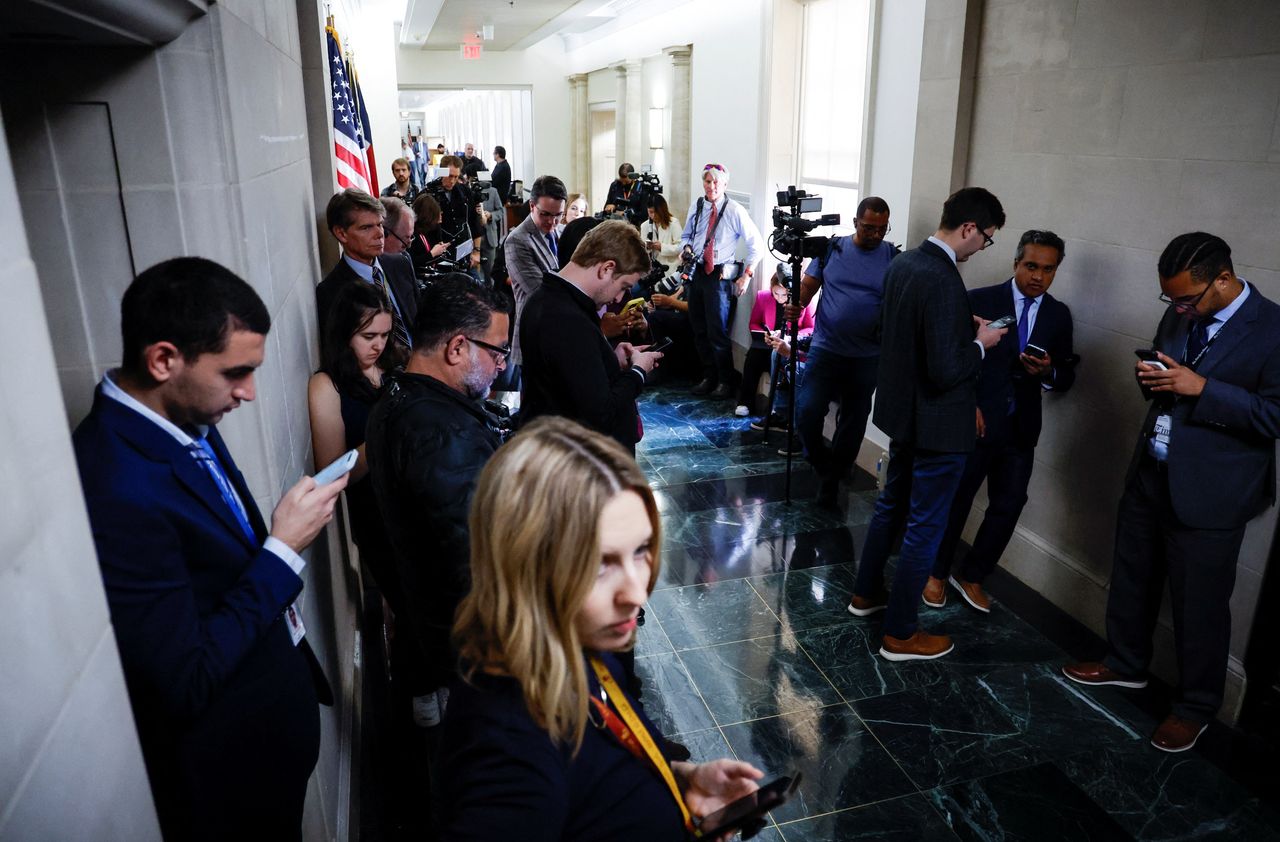 週二,國會山記者們在眾議院共和黨會議室外等候。圖片來源:喬納森·恩斯特/路透社充滿情緒宣泄和無記名投票的冗長會議讓共和黨議員們煩躁不已,他們竭力尋找能獲得足夠票數在院內當選的人選。一些議員穿着所謂的"老爹牛仔褲"和運動鞋四處走動,工作人員推着裝滿零食和汽水的托盤進出。