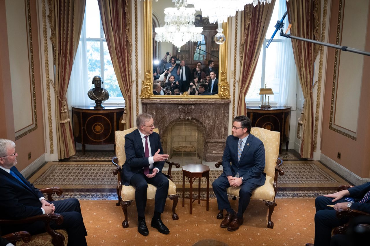 澳大利亞總理安東尼·阿爾巴尼斯(左)週四在美國國會大廈會見了眾議院議長邁克·約翰遜。照片:Drew Angerer/Getty Images