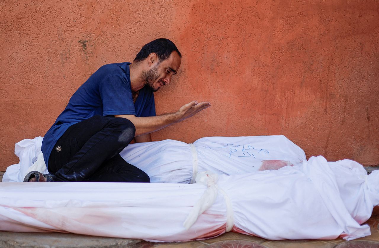 一名巴勒斯坦男子在女兒和妻子的屍體旁哭泣。圖片來源:穆罕默德·薩利姆/路透社蘇哈·馬耶為本文做出了貢獻。