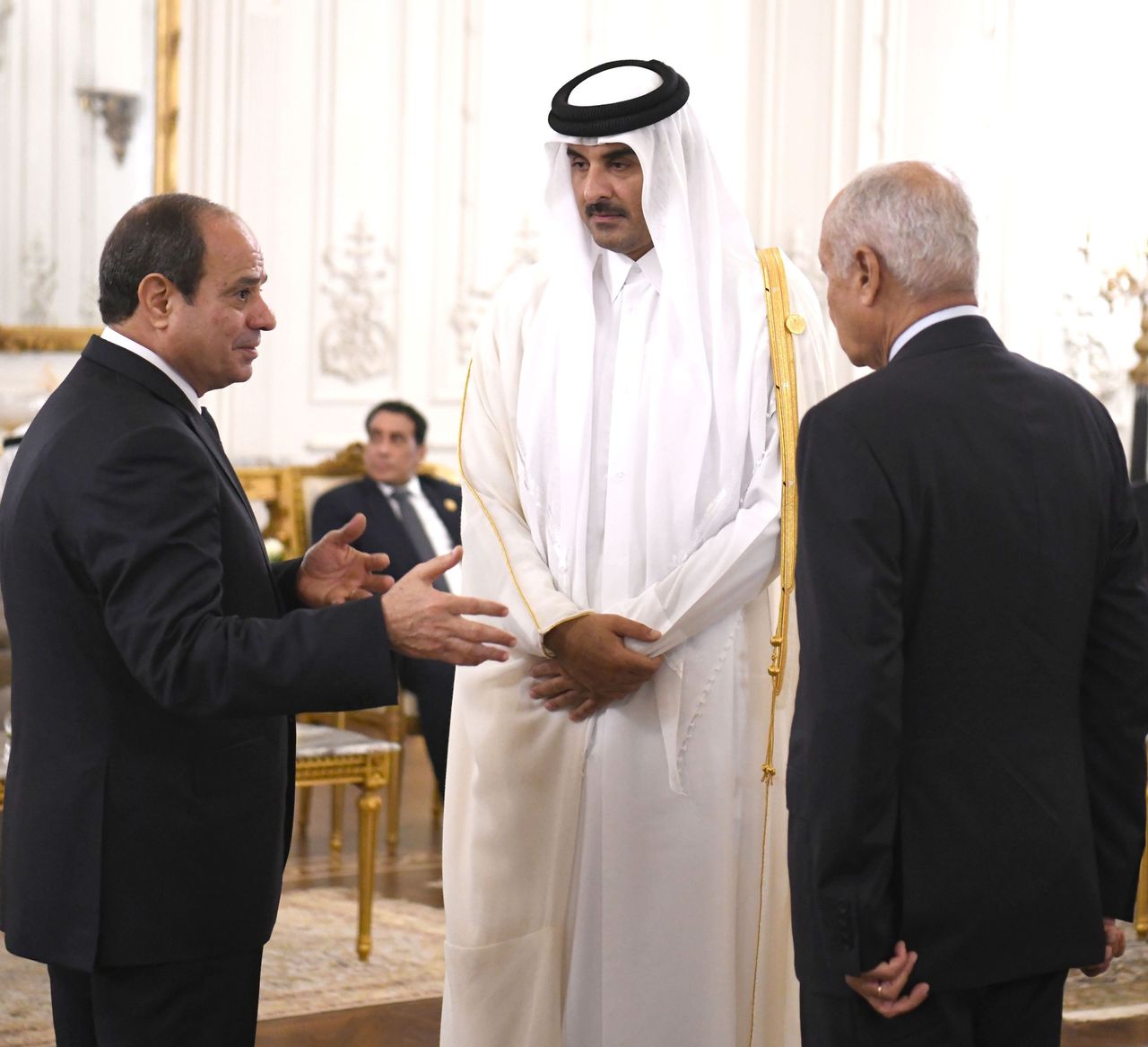 埃及總統阿卜杜勒·法塔赫·塞西與卡塔爾埃米爾及阿拉伯聯盟秘書長在開羅附近交談,10月21日。圖片來源:EPA/Shutterstock出現在2023年10月30日的印刷版中,標題為《卡塔爾是中東的誠實中間人》。