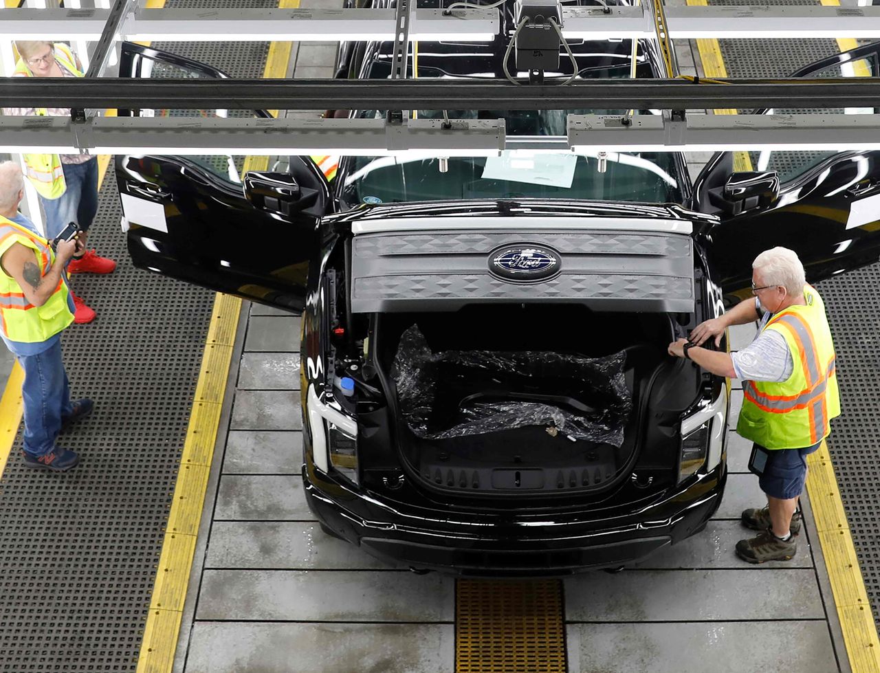 2022年9月20日,密歇根州迪爾伯恩市福特汽車工廠正在生產的電動版F-150 Lightning卡車。圖片來源:傑夫·科瓦爾斯基/法新社/蓋蒂圖片社本文發表於2023年10月30日印刷版,標題為《準備迎接風電與電動車救助潮》