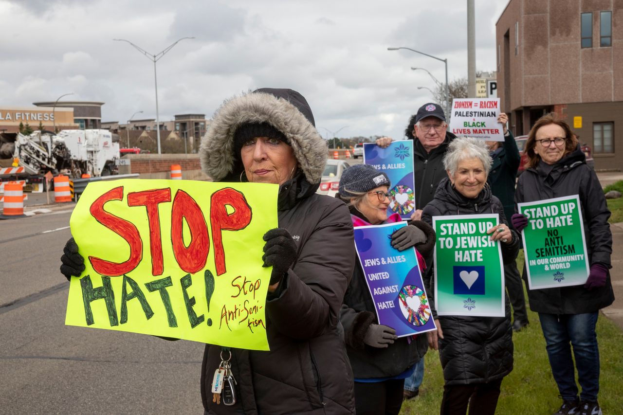 5月3日,密歇根州皇家橡樹市,“猶太和平之聲"成員及其支持者抗議反猶主義。圖片來源:Jim West/Zuma Press本文發表於2023年10月31日印刷版,標題為《反猶主義毒害美國》。