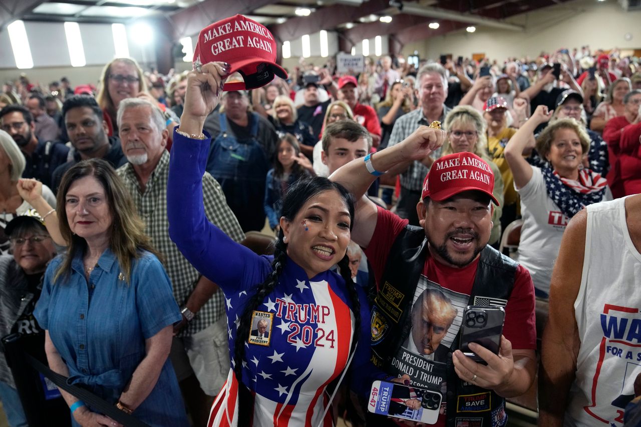 上月艾奧瓦州馬科基塔市特朗普競選集會的支持者。圖片來源:Charlie Neibergall/Associated Press國會民主黨人表示,若特朗普再次當選而民主黨掌控參眾兩院,將對其行動展開調查,但要以足以推翻總統否決權的多數通過反制其政策的立法仍面臨挑戰。