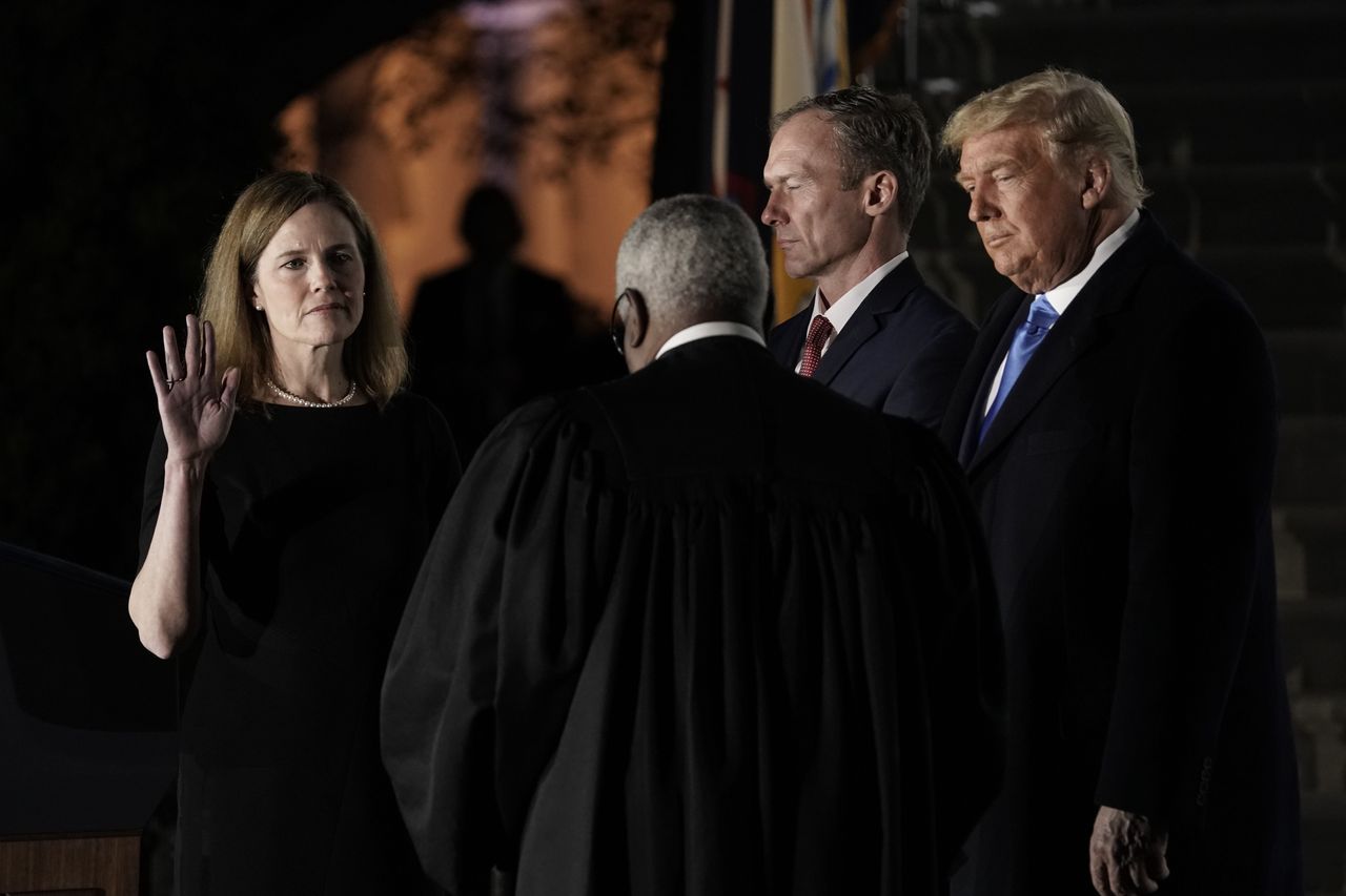 2020年,特朗普提名的第三位大法官埃米·科尼·巴雷特(中)在克拉倫斯·托馬斯大法官主持下宣誓就職。圖片來源:肯·塞德諾/PRESS POOL與此同時,熟悉他的人士擔憂,獲得連任的特朗普可能將法律邊界推向比第一任期更極端的境地,並任用不願約束其衝動行事的顧問。