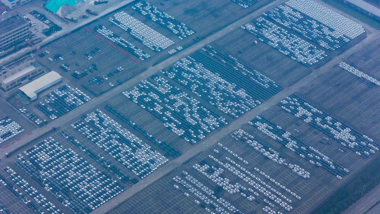 中國某港口待出口車輛航拍圖。圖片來源:Cfoto/Zuma Press
