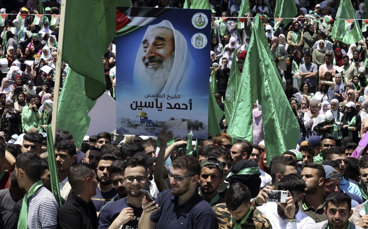 2022年5月19日,約旦河西岸拉姆安拉民眾揮舞謝赫·艾哈邁德·亞辛肖像。圖片來源:阿巴斯·莫馬尼/法新社/蓋蒂圖片社原文刊登於2023年11月10日印刷版,標題為《哈馬斯的神學邏輯》。
