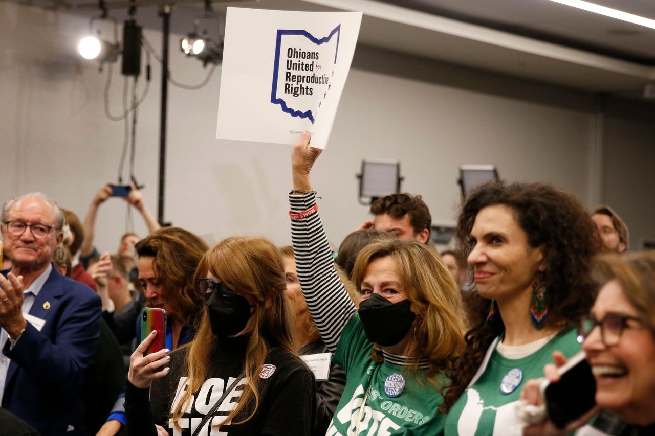 11月7日,俄亥俄州哥倫布市,一位選舉觀戰派對參與者高舉支持墮胎的標語,回應第一號議題的公投結果。圖片來源:蒂芙尼·布朗寧/祖瑪通訊社摘自俄亥俄州共和黨參議員J.D.萬斯11月8日關於確立墮胎憲法權利的公投倡議推文: