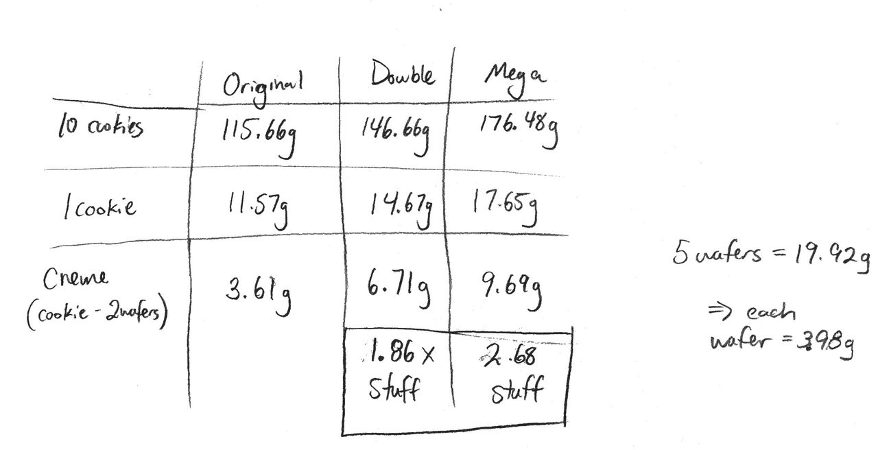 在11月最近的一天,芝加哥的一包普通裝奧利奧裏的餅乾看起來夾着不同量的奶油。一些雙倍夾心餅乾的寬度與最厚的普通奧利奧相似,但奶油通常會鋪展到餅乾邊緣更遠的地方。