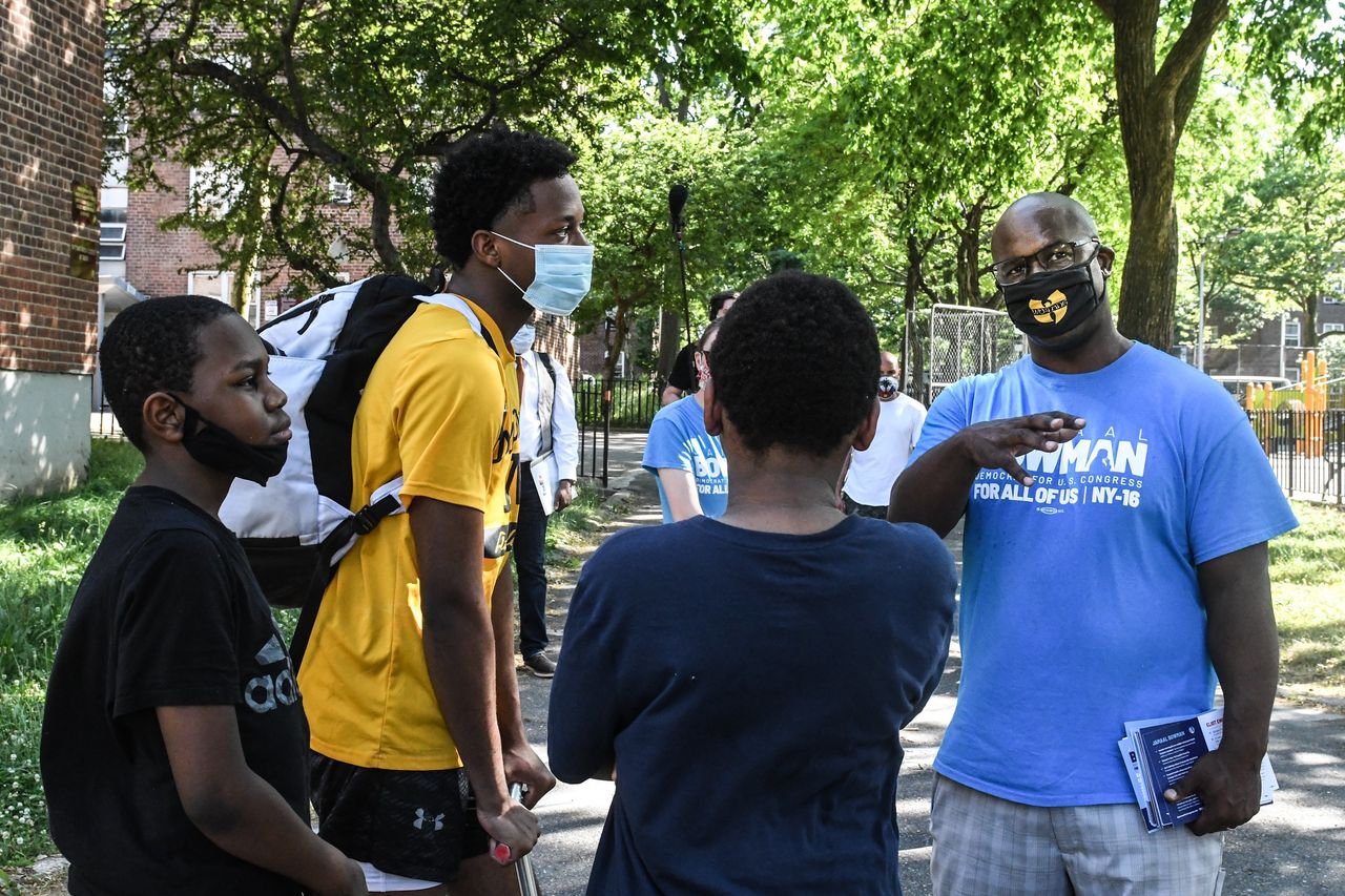 2020年6月紐約初選前日,賈馬爾·布朗在布朗克斯區開展競選活動。圖片來源:斯蒂芬妮·基思/蓋蒂圖片社2020年與埃利奧特·恩格爾的初選對決,發生在白人警察殺害黑人喬治·弗洛伊德事件約一個月後。身為黑人的鮑曼在競選活動中講述自身遭遇警察的經歷。當恩格爾在華盛頓郊外宅邸度過疫情封鎖期時,鮑曼現身抗議現場的身影形成鮮明對比。