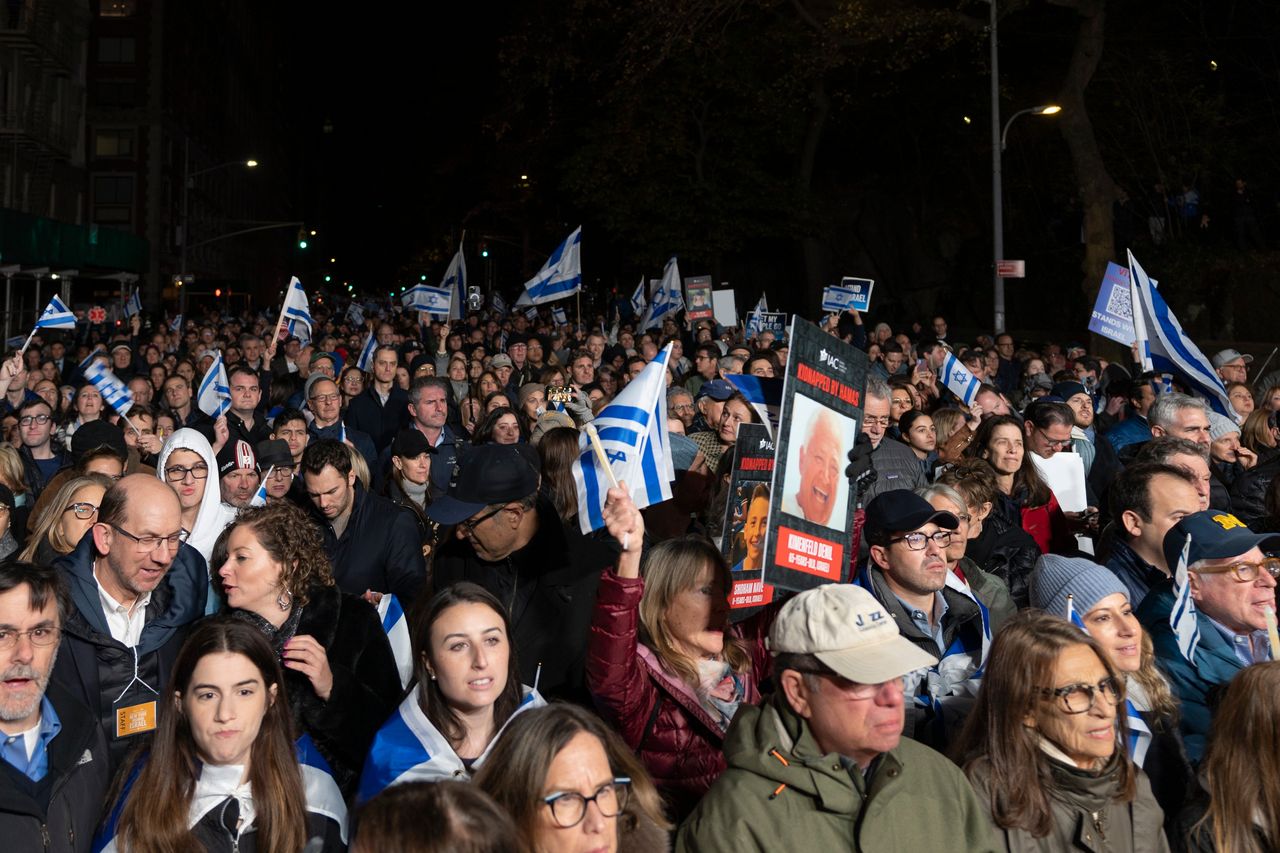 11月6日,以色列支持者在紐約參加集會守夜活動,紀念哈馬斯襲擊以色列30天。圖片來源:彼得·K·阿弗裏耶/美聯社載於2023年11月15日印刷版,標題為《紐約猶太人擁抱持槍權》。
