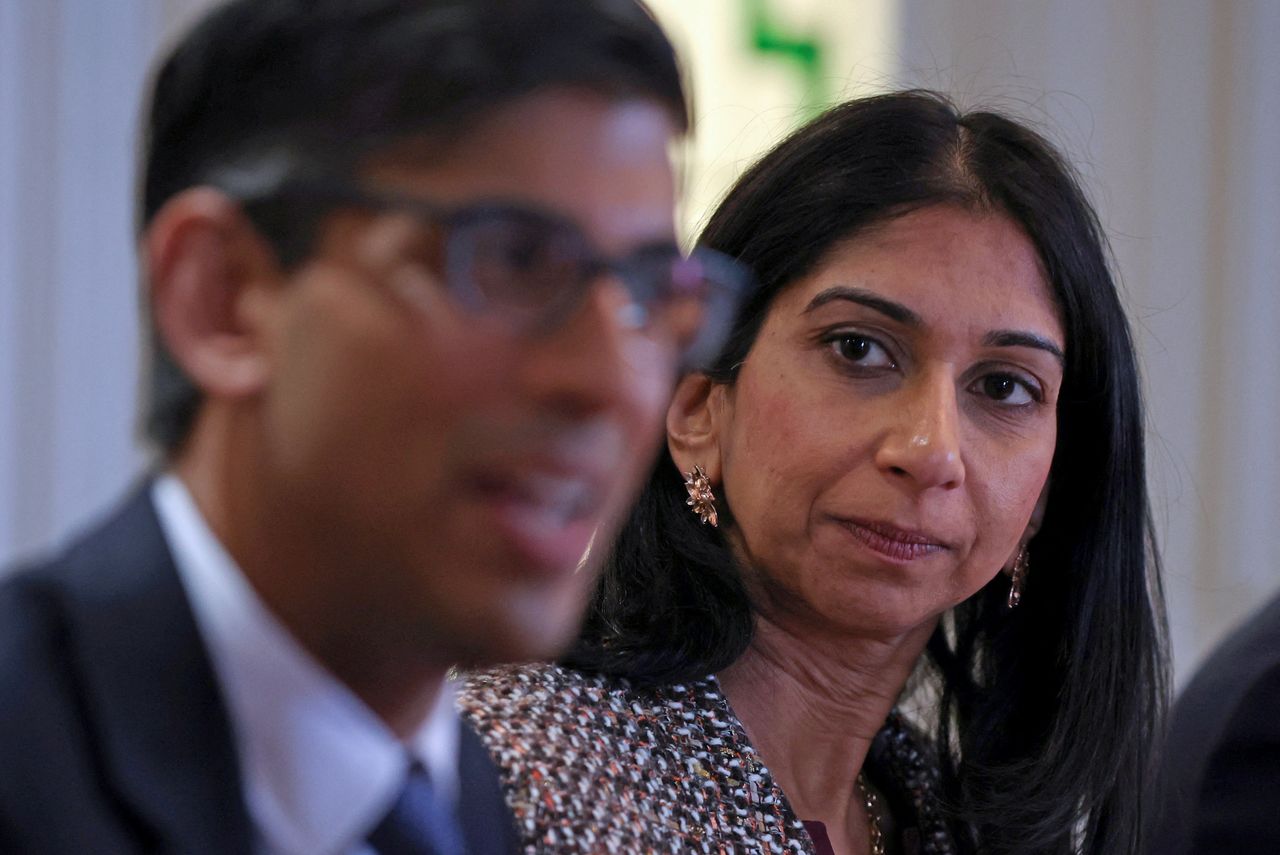 11月13日,蘇拉·佈雷弗曼在英格蘭羅奇代爾會議上聆聽首相里希·蘇納克發言。圖片來源:菲爾·諾布爾/祖瑪通訊社刊載於2023年11月15日印刷版,原標題為《裏希·蘇納克與保守主義英格蘭的奇異死亡》。