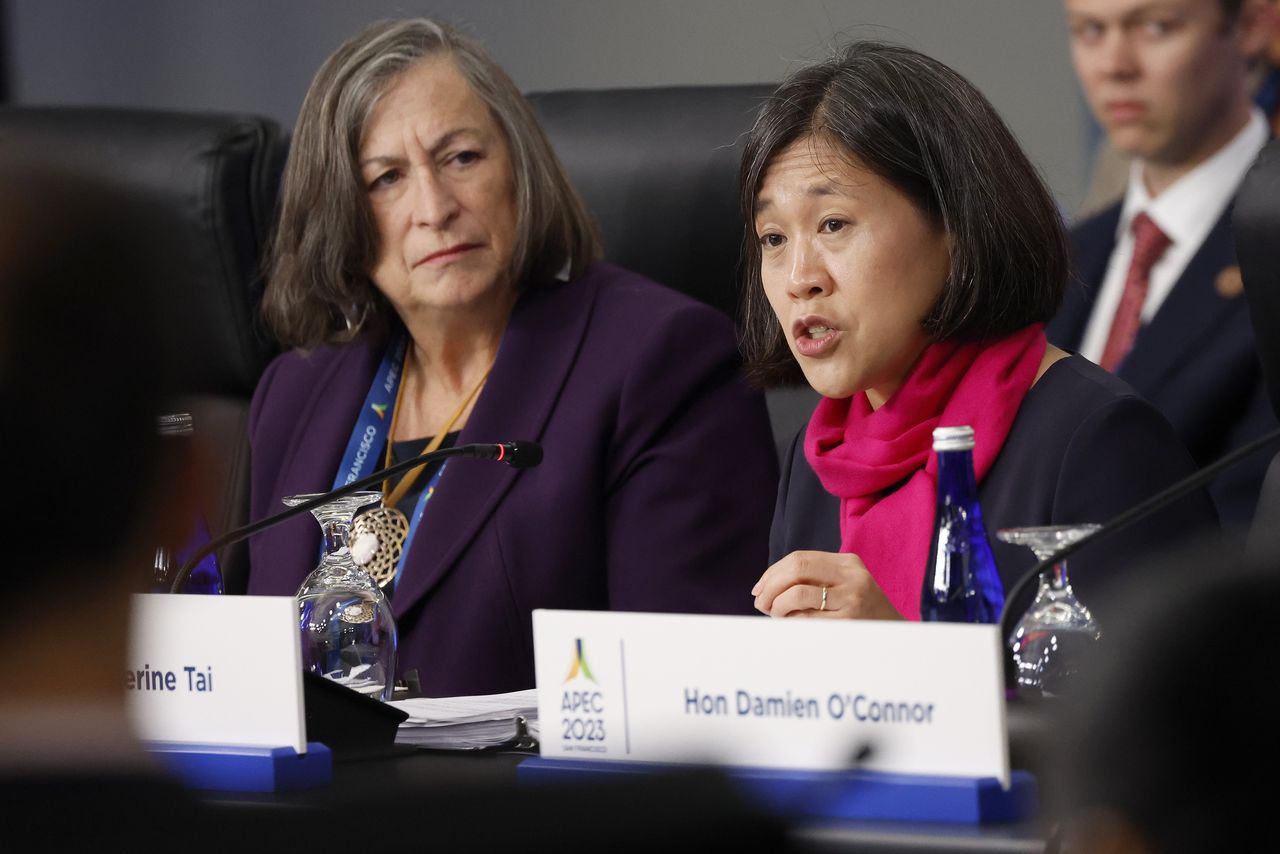 美國貿易代表戴琪(右)週二在舊金山舉行的亞太經合組織(APEC)峯會上發表講話。圖片來源:john g mabanglo/Shutterstock本文發表於2023年11月15日印刷版,標題為《拜登總統送給中國的貿易禮物》。