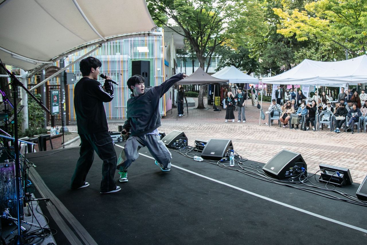 他們翻唱了一首韓國嘻哈歌曲,劉還改編了其中一段歌詞。最後,他們活力四射地跳起了防彈少年團的《Idol》。表演結束時,觀眾已增至近50人。