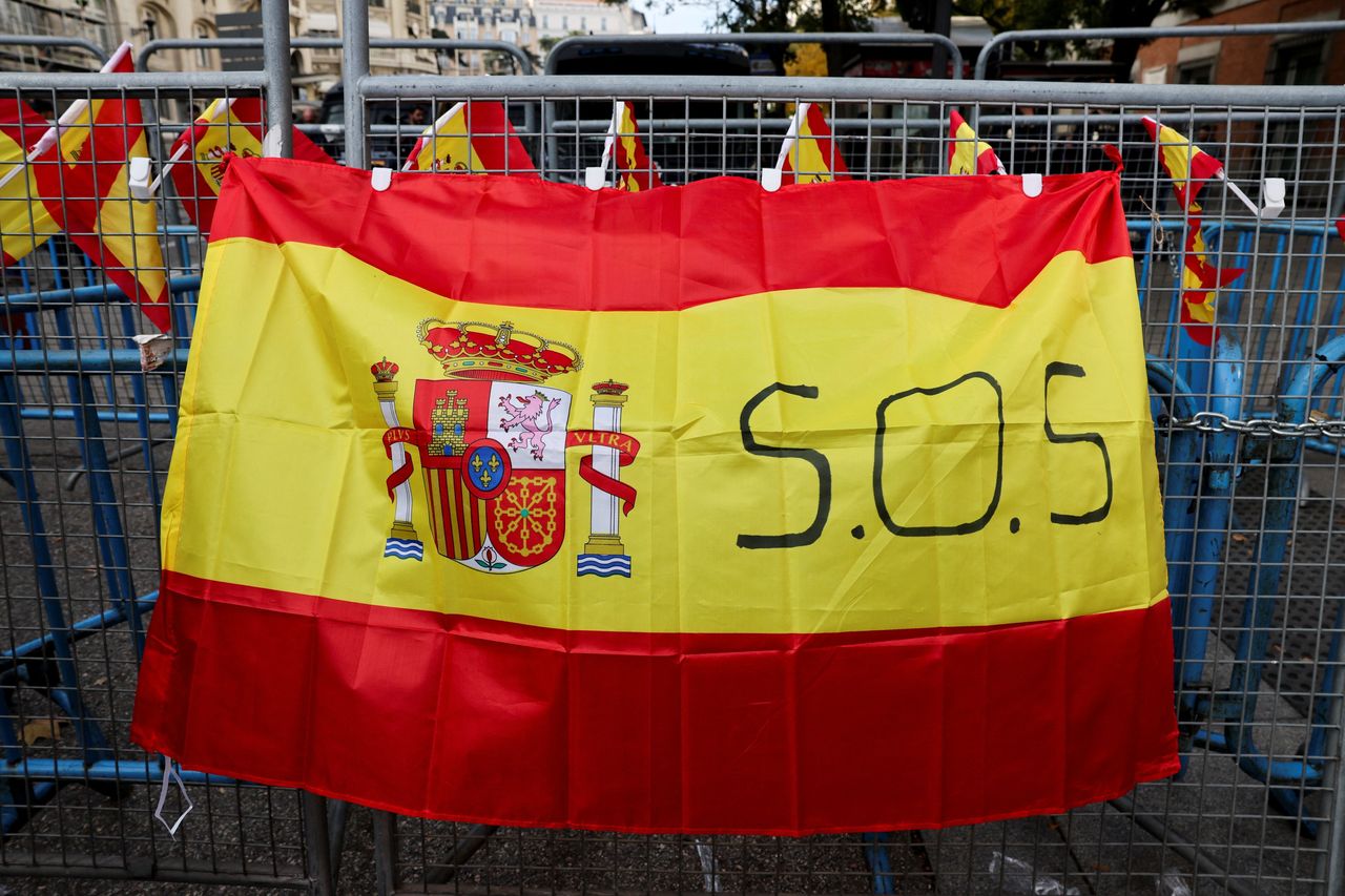 11月15日馬德里議會外抗議活動中展示的西班牙國旗。圖片來源:violeta santos moura/路透社載於2023年11月17日印刷版,標題為《西班牙的分裂危機》。