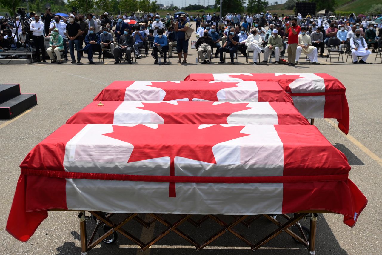 覆蓋着加拿大國旗的棺材在四名遇難的阿夫扎爾家庭成員的葬禮上展示。照片:內森·德內特/美聯社警方當時表示,他們認為阿夫扎爾家庭因其伊斯蘭信仰而成為目標。根據加拿大人口普查數據,阿拉伯裔移民是該市最大的族裔羣體之一。