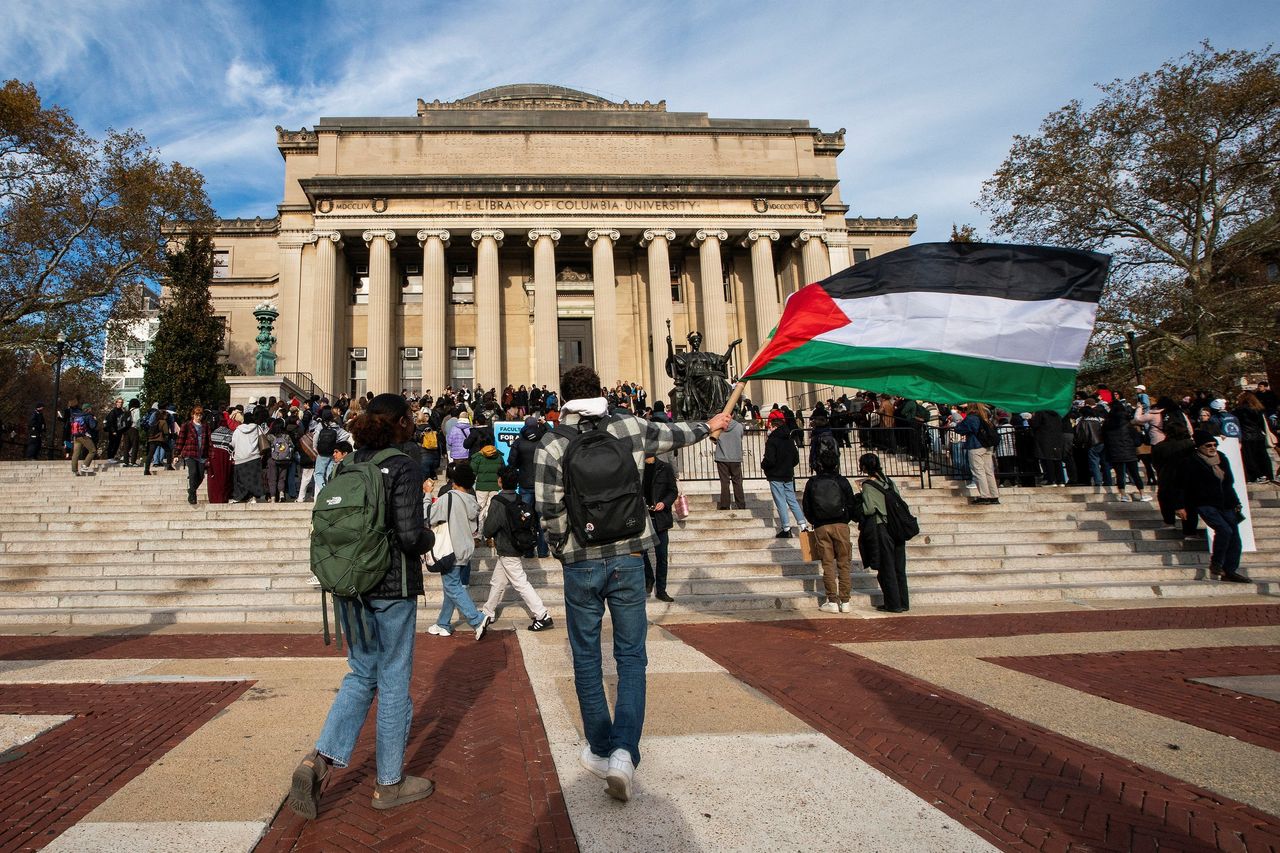 11月15日,紐約哥倫比亞大學集會上的抗議者。圖片來源:eduardo munoz/路透社刊登於2023年11月18日印刷版,標題為《哈馬斯的野蠻行徑加劇高等教育危機》。
