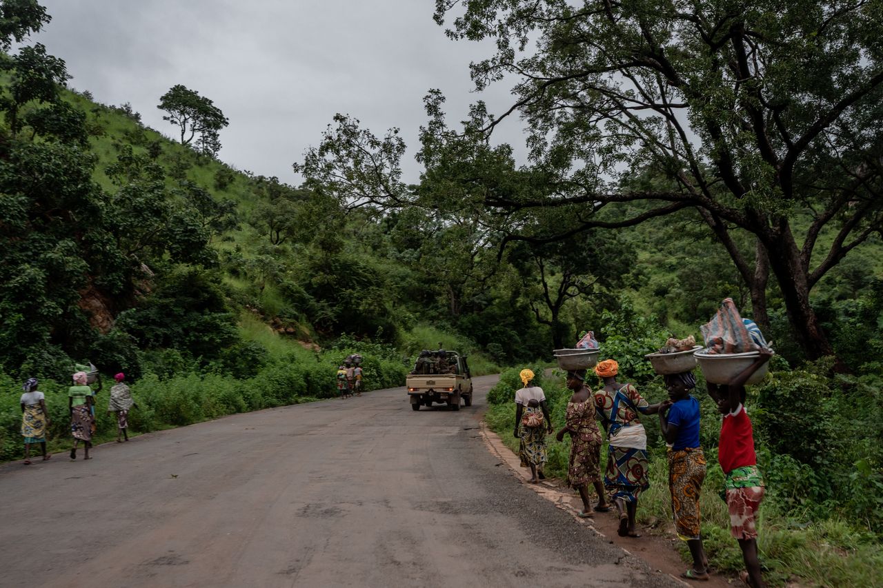 一輛軍車經過貝寧一條道路上扛着木薯的婦女們。聯繫邁克爾·M·菲利普斯,郵箱:[email protected]