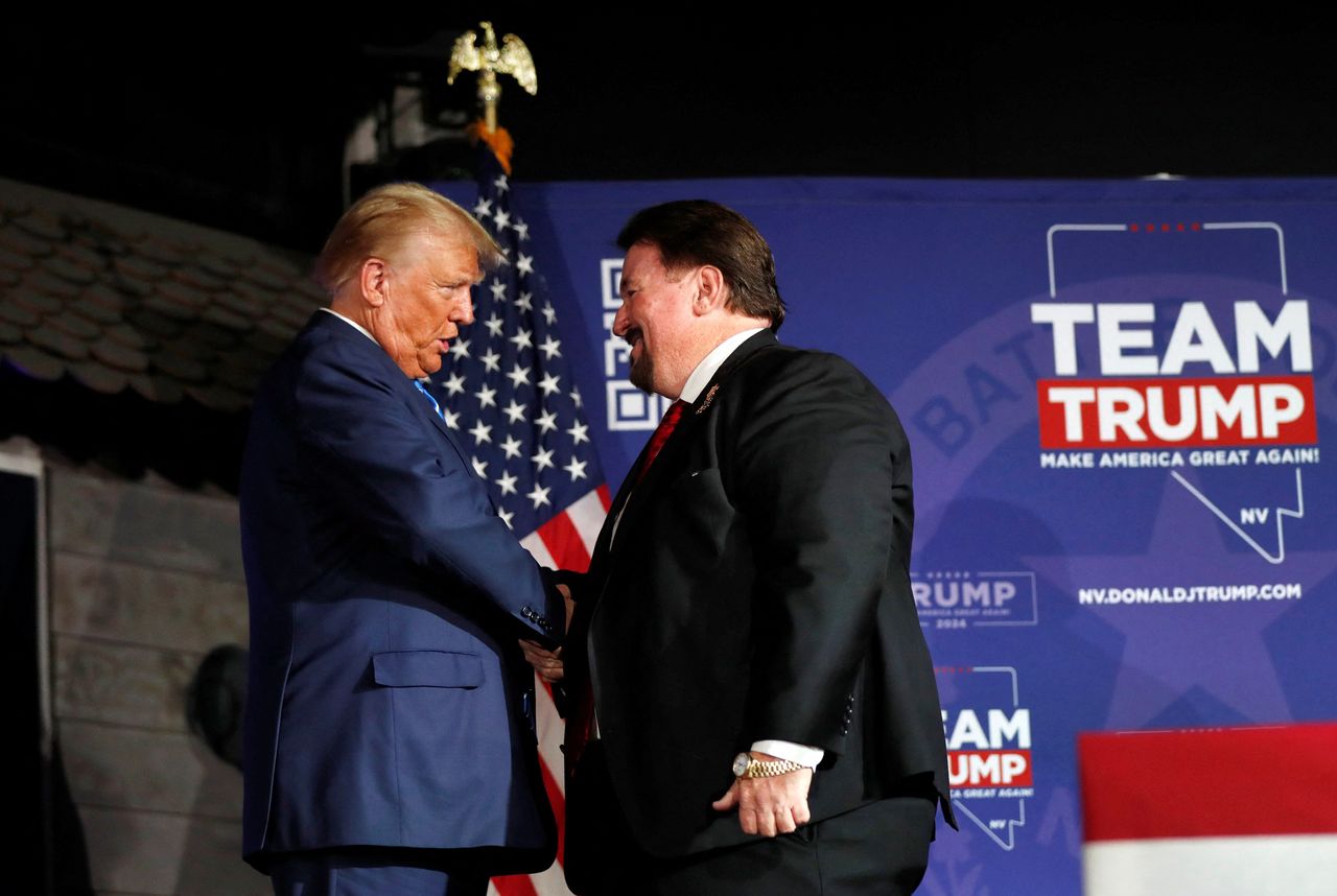 前總統唐納德·特朗普與內華達州共和黨主席邁克爾·麥克唐納在拉斯維加斯的一次集會上。圖片來源:史蒂夫·馬庫斯/路透社黨團會議的批評者表示,這是由支持特朗普的州政黨設立的,即使該黨尚未正式支持他。在特朗普輸掉2020年大選後,共和黨主席麥克唐納是那些錯誤地聲稱自己是合法州選舉人並承諾投票給特朗普的人之一。在最近的一次特朗普集會上,麥克唐納將特朗普介紹為"美國下一任總統”。