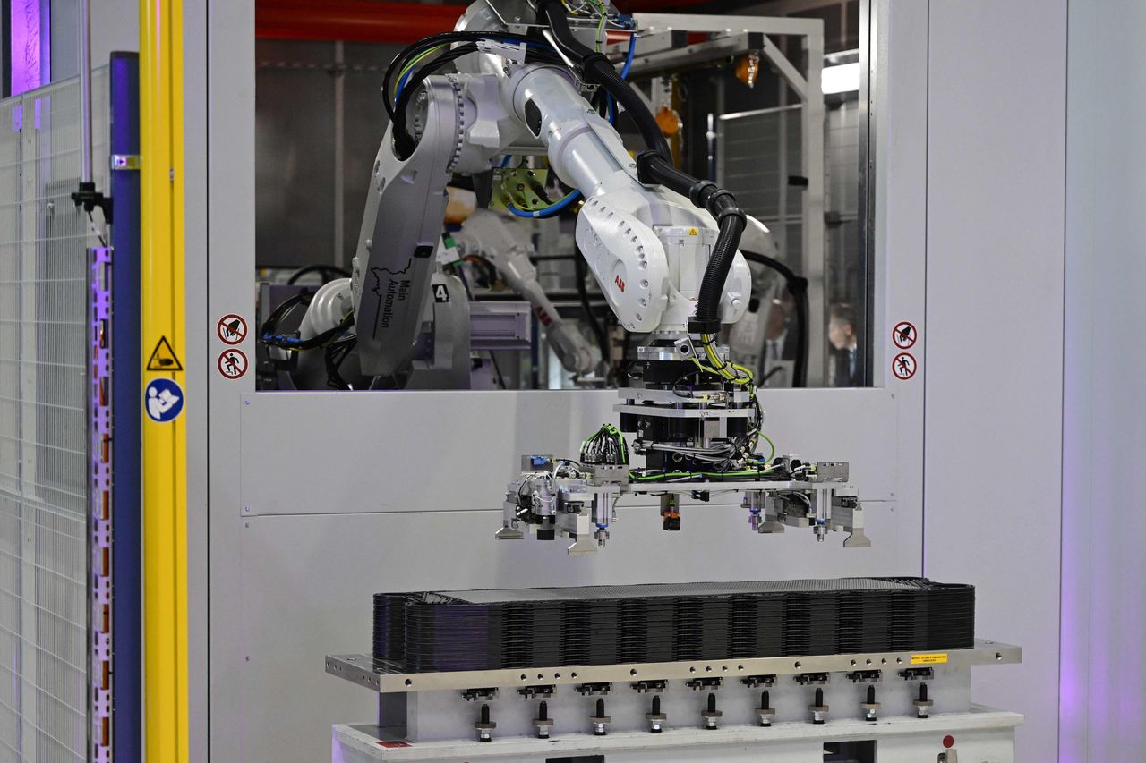 2023年11月8日,西門子能源與法國液化空氣集團合資建設的超級工廠在柏林正式投產後,機械臂正在電解槽上作業。(攝影:約翰·麥克杜格爾/法新社/Getty Images)圖片來源:約翰·麥克杜格爾/法新社/Getty Images德國聯邦統計局週五公佈的數據顯示,7月至9月德國經濟環比萎縮0.1%,與先前預估一致,表明該國可能已陷入衰退。