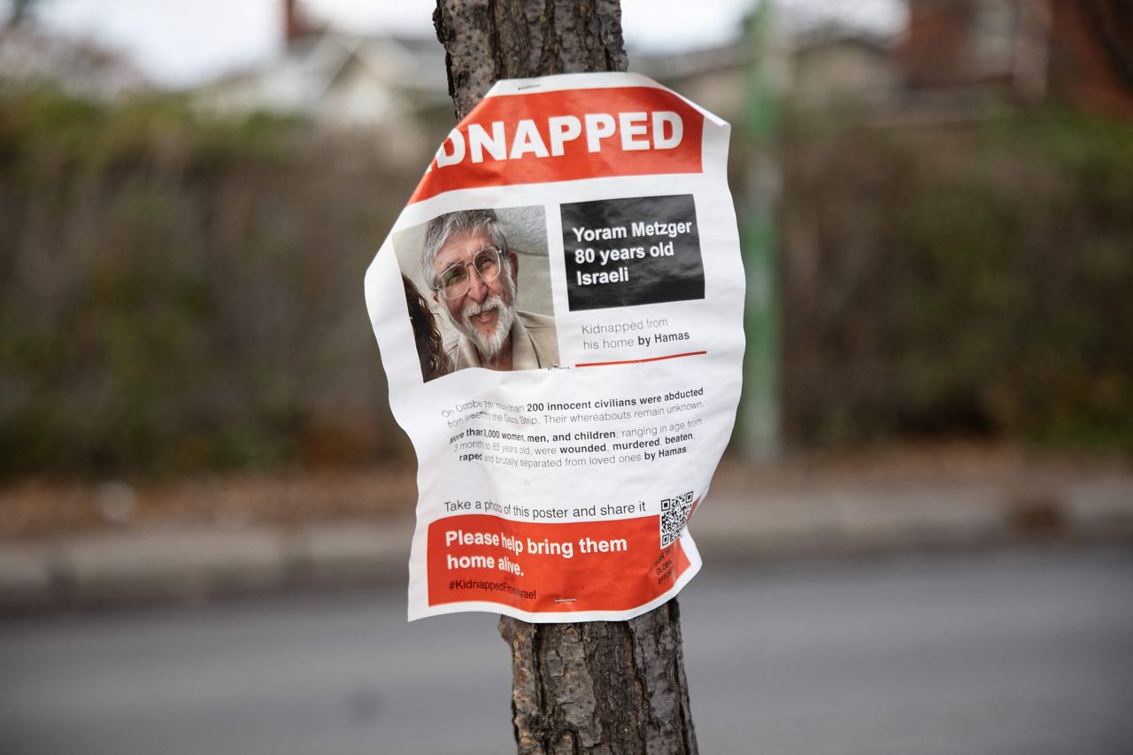 本月早些時候,加拿大魁北克省漢普斯特德展示的一張海報上,是80歲的以色列人質約拉姆·梅茨格的照片。圖片來源:Alexis Aubin/Agence France-Presse/Getty Images此前,摩西曾表示,即使協議按計劃於週五進行,也不能保證他77歲的母親瑪格麗特·摩西會被釋放。他年近80的父親加迪·摩西也被武裝分子扣押。