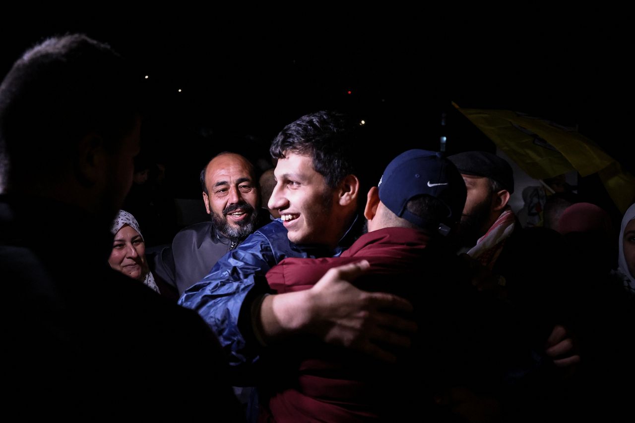 一名巴勒斯坦人在被以色列監獄釋放後,於約旦河西岸的拉姆安拉與親人相擁。圖片來源:kenzo tribouillard/法新社/蓋蒂圖片社