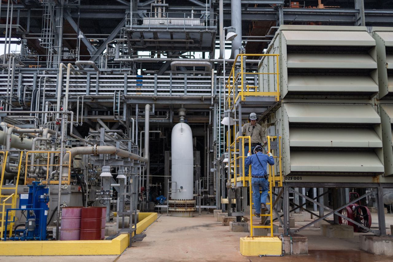 路易斯安那州唐納森維爾CF工業公司氨工廠內,操作員Chance Landry與Brian Uhler完成過濾器檢查後正在攀爬梯架。圖片來源:Kathleen Flynn/華爾街日報而氨卻能像純氫一樣無碳排放燃燒,且儲存運輸更為便捷。全球每年生產約1.8億噸氨,其中約10%參與國際貿易。