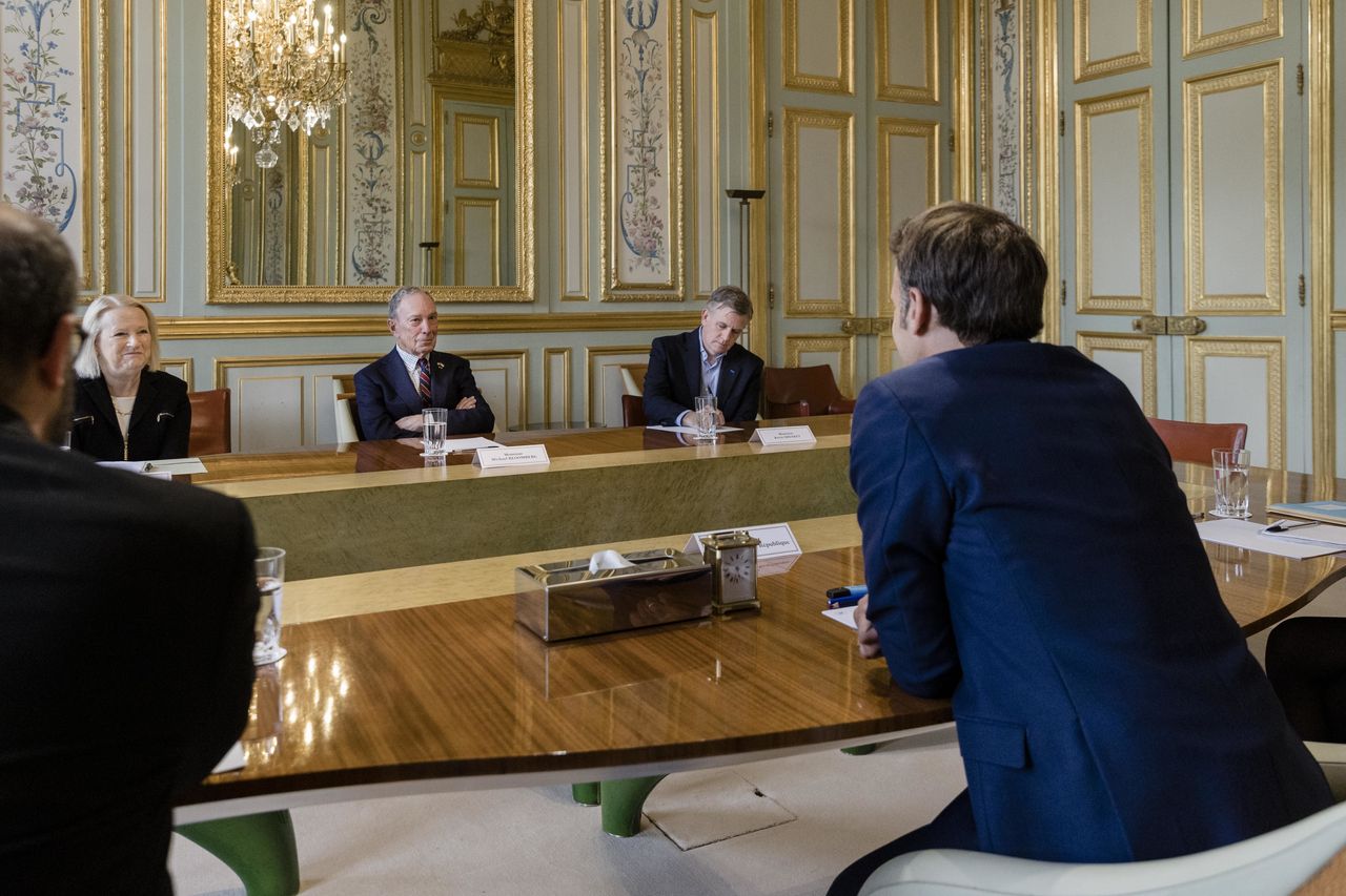 法國總統埃馬紐埃爾·馬克龍(前景中)、瑪麗·夏皮羅(左側面向鏡頭者)與邁克爾·布隆伯格(中)去年在巴黎討論淨零數據公共事業項目。圖片來源:馬琳·阿瓦德致力於研究如何報告可持續發展數據的企業,目前主要關注全球監管機構即將出台的少數強制性報告標準,但另一個項目或許值得關注——淨零數據公共事業(NZDPU)。