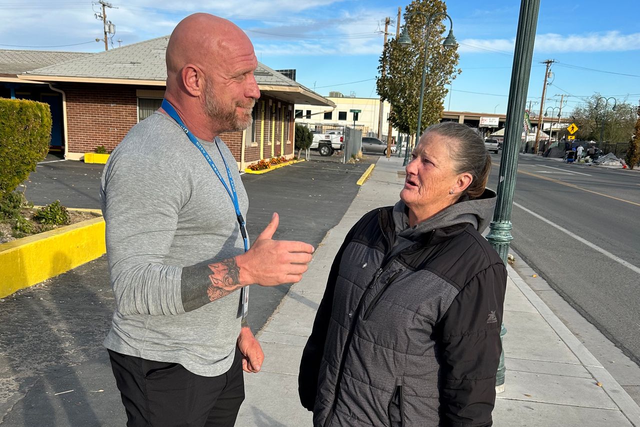 曾無家可歸的格蘭特·丹頓試圖説服辛迪·蒂利爾離開街頭搬進內華達關懷園區。圖片來源:吉姆·卡爾頓/華爾街日報瓦肖縣警長達林·巴拉姆表示,他有一支專門在全縣進行無家可歸者外展服務的團隊,截至今年10月,該團隊已成功讓121人脱離街頭。
