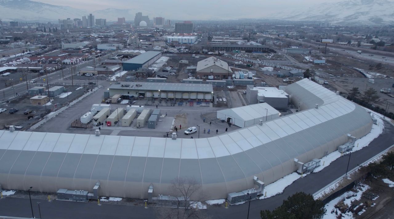 2021年初,裏諾市、斯帕克斯市和沃肖縣聯合建造了一座近足球場大小的馬蹄形織物結構。他們在裏諾市中心以東一英里處購置了15英畝土地,搭建這座可容納604人的帳篷,作為無家可歸者收容園區的一部分——該園區還在原棒球場地上搭建了多排帳篷,可額外容納50人。