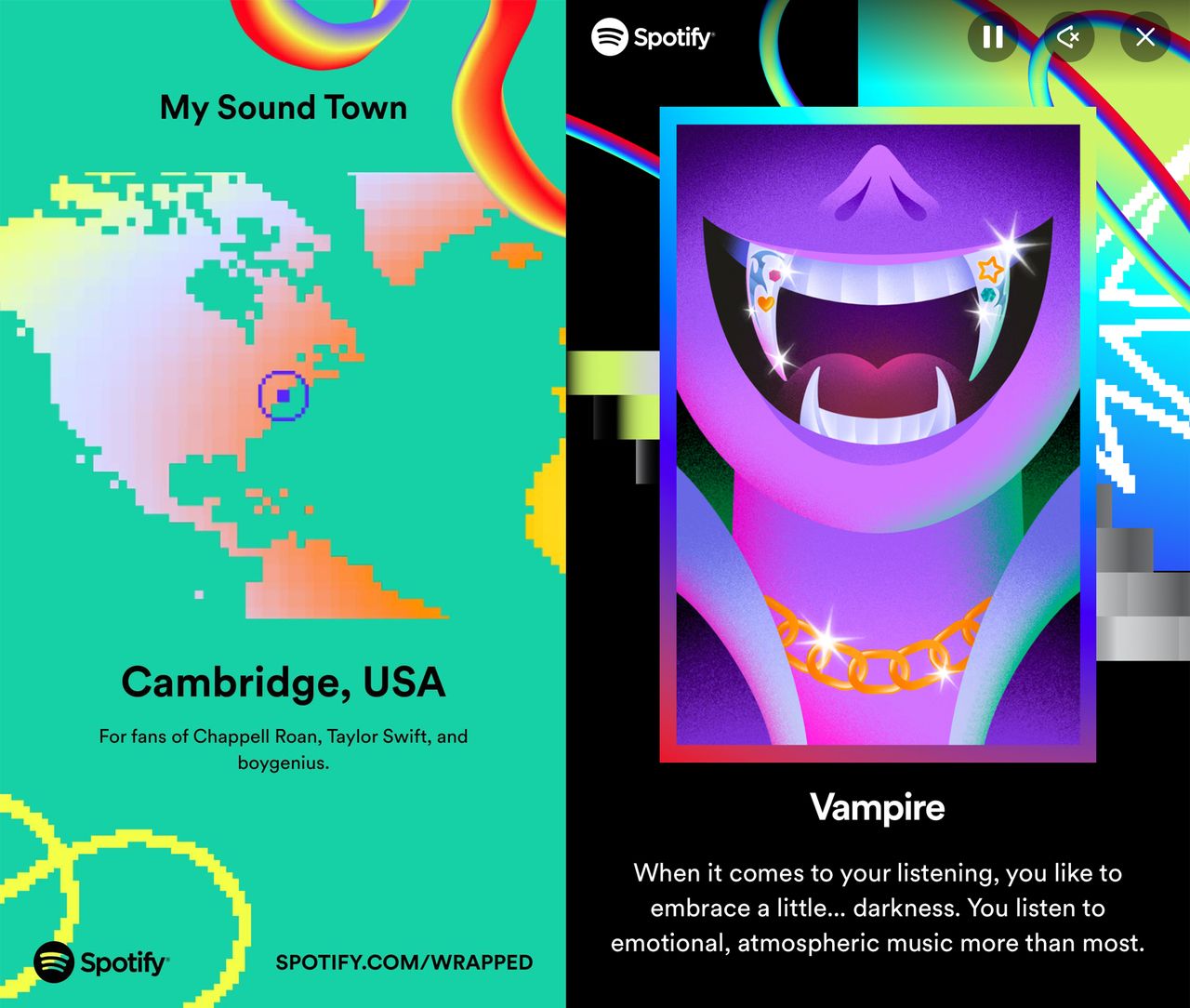 今年的Spotify Wrapped新增了兩項功能:一項聚焦用户的流媒體習慣,另一項則根據聽歌偏好和藝術家喜好為用户匹配契合城市。Spotify每年都會為Wrapped增添新花樣。除了電腦端可查看外,新增的"2023年度形象"功能會為用户分配12種聽歌人格主題之一,比如喜歡聽"情緒化、氛圍感音樂"的用户會被標記為"吸血鬼"人格。