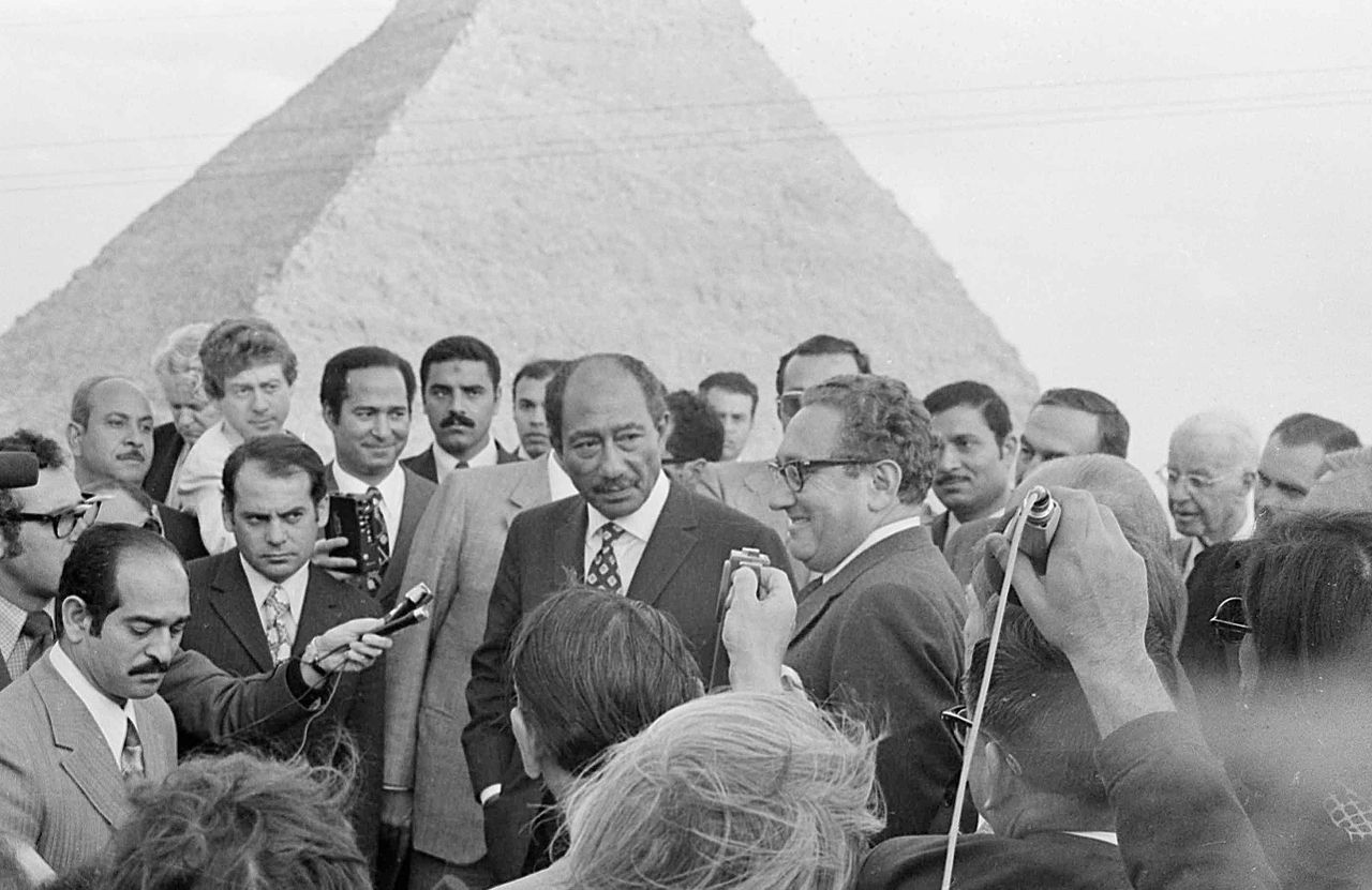 1974年埃及總統安瓦爾·薩達特與基辛格在金字塔前舉行聯合記者會。圖片來源:美聯社