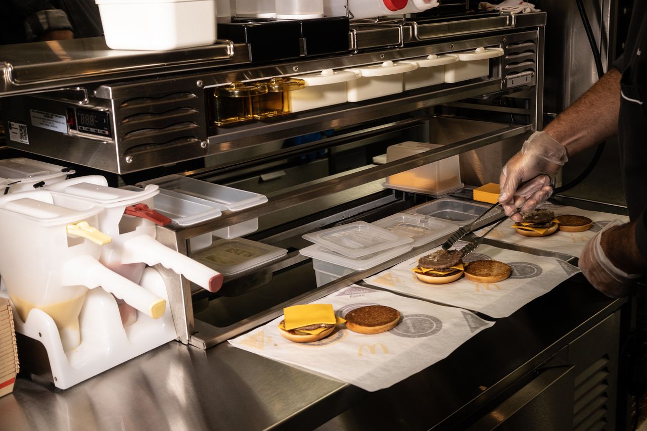 今年早些時候,在麥當勞芝加哥總部的測試廚房裏,主廚查德·謝弗按標準流程製作雙層芝士漢堡——搭配生洋葱片、冷藏芝士片和標準漢堡胚。