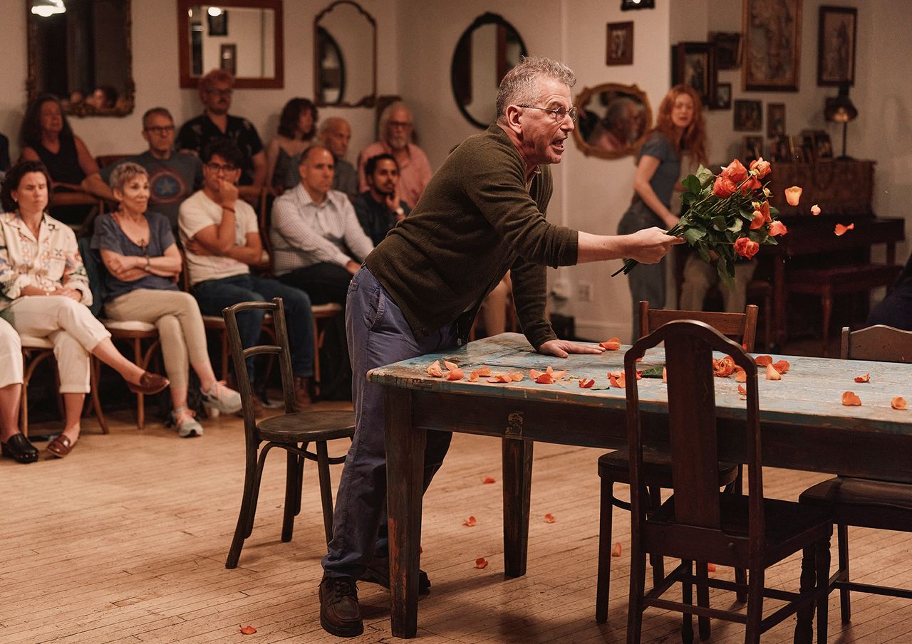 大衞·克羅默(中)與馬林·愛爾蘭(背景中)攝影:埃米利奧·馬德里契訶夫是公認的戲劇大師,他以柔和的聚光燈照亮了潛藏在人類經驗深處的晦暗不幸與不滿。今年有兩部非凡的作品——成為反思過去、現在或未來生活的關鍵稜鏡。較為傳統的是小劇場版**《萬尼亞舅舅》**。該劇在閣樓空間演出,由導演兼演員大衞·克羅默飾演萬尼亞,主要依靠燭光照明,但表演卻煥發出鮮明奪目的清新感:這裏沒有慣常那種在註定失望的人生道路上蹣跚前行的萎靡角色,而是充滿張力的人物——他們感到被命運和環境所束縛,卻仍能看到掙脱的潛力。