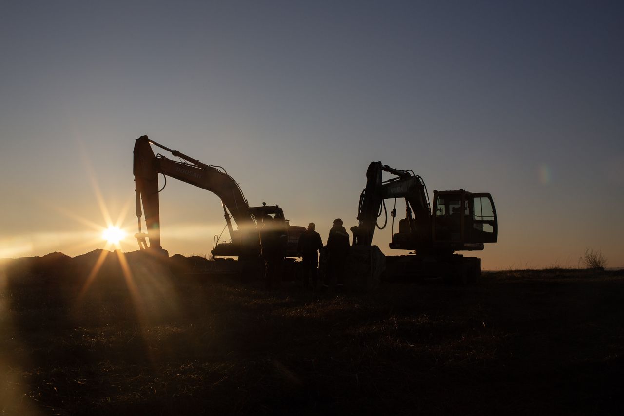 近日,在東部小城利曼附近俯瞰森林平原的山頂上,部分防禦工事已初現雛形。距前線約12英里處,兩名操作挖掘機的工人正在白堊土上開鑿戰壕。