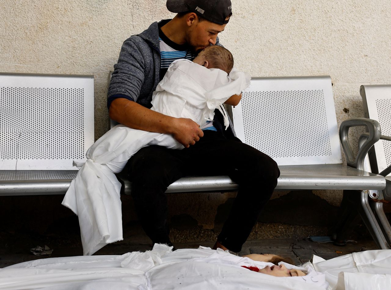週二,一名巴勒斯坦男子坐在死於以色列空襲的子女遺體旁。圖片來源:Mohammed Salem/Reuters