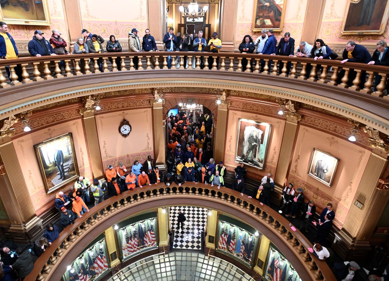 3月14日,工會成員和支持者在密歇根州議會大廈內高呼口號,等待立法者對蘭辛市的一項反工作權法案進行投票。圖片來源:託德·麥金特夫/美聯社刊登於2023年12月13日印刷版,標題為《“工人選擇權"是前進方向》。