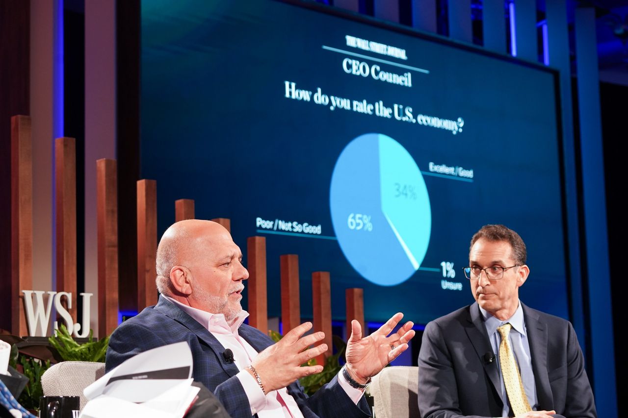 託尼·法布里齊奧(左)在《華爾街日報》CEO理事會峯會上討論政治民調。圖片來源:拉爾夫·阿爾斯旺/華爾街日報經濟消息正在好轉——但拜登總統的支持率卻在下降,大量選民對未來感到悲觀。