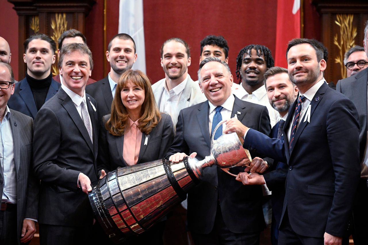 蒙特利爾雲雀隊球員馬克-安託萬·德奎(第二排中)在魁北克市議會接受新科冠軍表彰儀式。圖片來源:雅克·布瓦西諾/加拿大新聞社/美聯社魁北克省政府通過了一系列新法規,進一步要求公民在日常生活中使用法語。