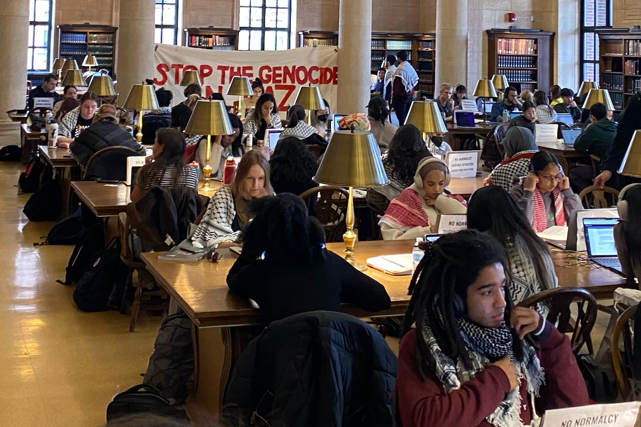 當我登上著名的威德納閲覽室時,眼前的景象令人震驚:滿室學生幾乎都戴着阿拉伯頭巾。每枱筆記本電腦和部分枱燈上張貼着"種族滅絕無常態——還巴勒斯坦正義"的傳單,一名年輕女性向每位入場者分發。閲覽室盡頭懸掛的猩紅橫幅赫然寫着"停止加沙種族滅絕"。