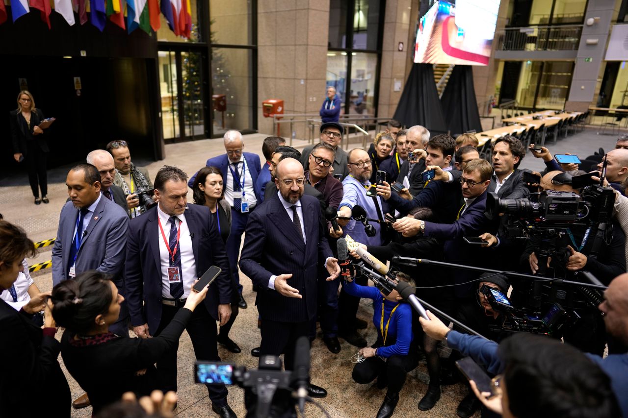 歐盟理事會主席夏爾·米歇爾在峯會期間向媒體發表講話。照片:弗吉尼亞·梅奧/美聯社儘管如此,開啓入盟談判的協議仍標誌着烏克蘭總統弗拉基米爾·澤連斯基的勝利。本週早些時候,他離開華盛頓時未能獲得烏軍急需的新軍事援助。
