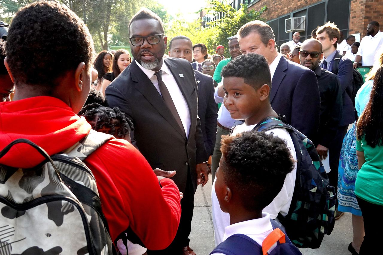 芝加哥市長布蘭登·約翰遜在8月21日貝德勒小學開學首日向學生、家長及教職工緻意。圖片來源:斯科特·奧爾森/蓋蒂圖片社刊發於2023年12月19日印刷版,標題為《芝加哥教育平等的困局》。