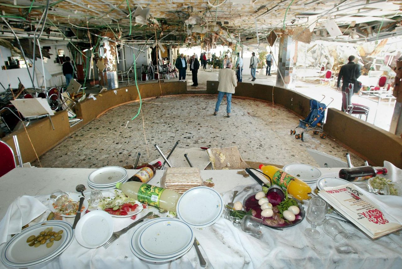2002年3月28日,以色列內坦亞,哈馬斯自殺式襲擊後,猶太逾越節餐食的殘骸。圖片來源:托馬斯·科克斯/法新社通過蓋蒂圖片社刊登於2023年12月19日印刷版,標題為《哈馬斯視和平為軟弱》。