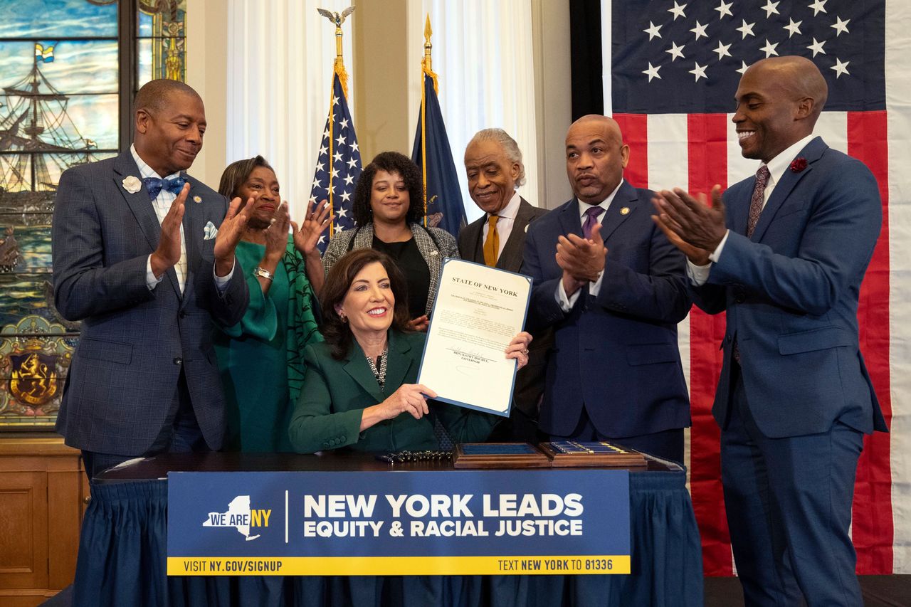 紐約州州長凱西·霍楚(居中坐者)簽署法案,成立委員會調查針對非洲裔的奴隸制及種族經濟歧視問題,並研究賠償方案。圖片來源:唐·波拉德/美聯社紐約州州長凱西·霍楚簽署了一項法案,該法案可能為向美國黑人支付賠償金鋪平道路,以彌補該州的奴隸制歷史。