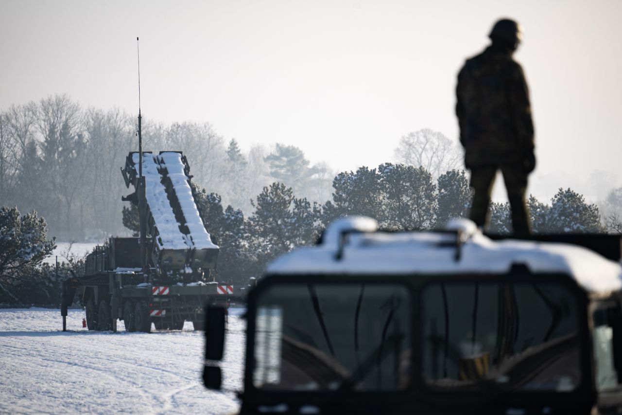 一名士兵站在德國境內為烏軍培訓時展示的"愛國者"導彈防禦系統前的卡車上,該系統可擊落無人機。圖片來源:塞巴斯蒂安·戈爾諾夫/祖瑪通訊社高功率微波系統即便有效,也難以擊落空中所有無人機,但研發者強調這將是分層防禦體系的重要一環。
