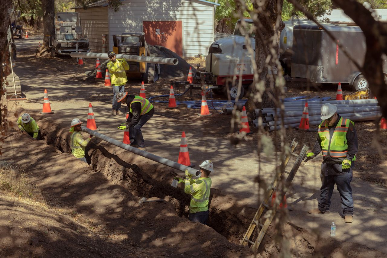 工人們正在準備一條溝渠,將PG&E的電線埋入地下,位於加利福尼亞州上湖地區的高野火風險區域。照片:普雷斯頓·甘納威為《華爾街日報》拍攝一項兩黨立法正在國會審議中,該立法將免除火災受害者對其賠償金支付聯邦所得税的義務,這是更廣泛税收方案的一部分。