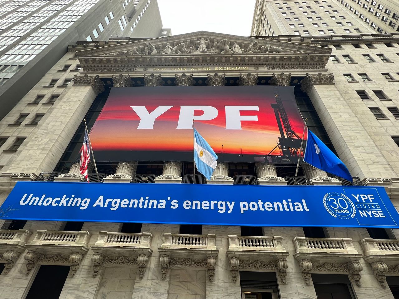 阿根廷新政府承諾將國有石油公司YPF私有化,其橫幅近期出現在紐約證券交易所。圖片來源:莎拉·雅埃茲-理查茲/祖瑪通訊社週三,這位自稱無政府資本主義者頒佈了一系列旨在消除國家在關鍵經濟領域作用的措施。此舉兑現了他競選時削減税收、通過裁撤半數政府部門大幅縮減開支的承諾,並最終將控制瓦卡穆爾塔油田約三分之一產量的國有能源企業YPF私有化。