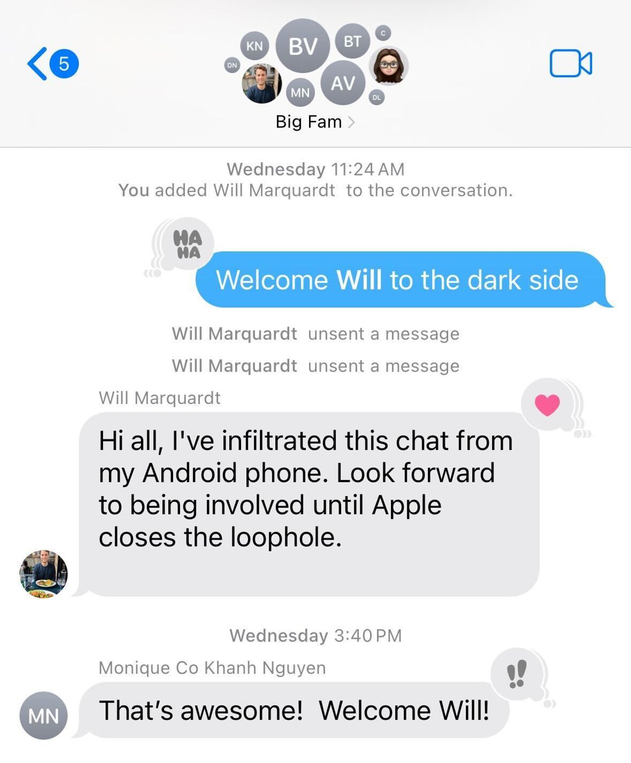 經過近10年,我的丈夫威爾終於加入了阮家的iMessage羣聊。